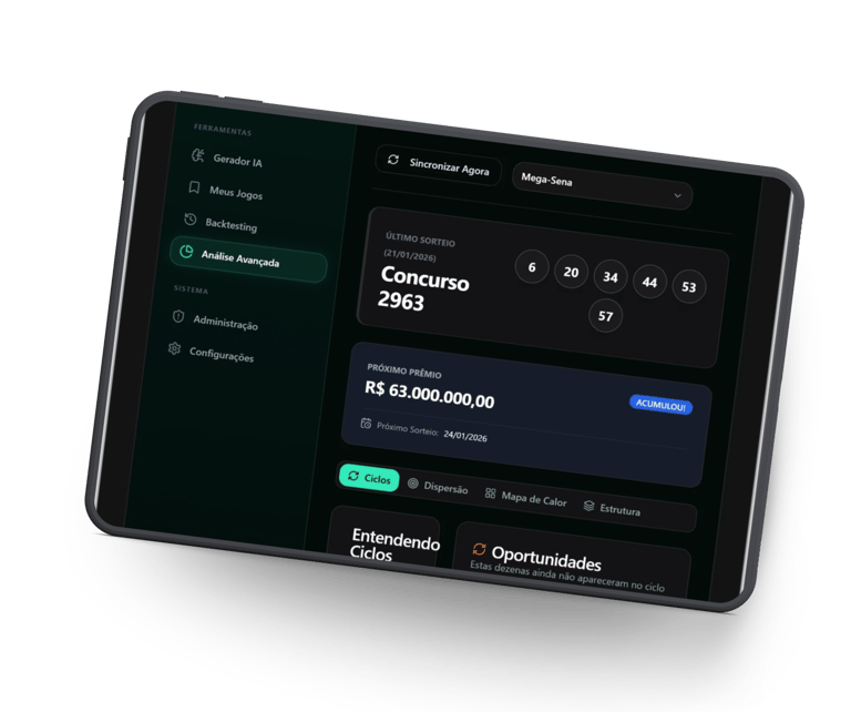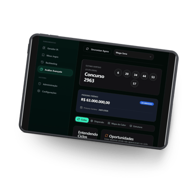 Em vez de escolher números por impulso ou repetir sempre os mesmos, voce passa a usar um sistema que analisa, calcula e sugere, trazendo mais lógica e estratégia para cada aposta.